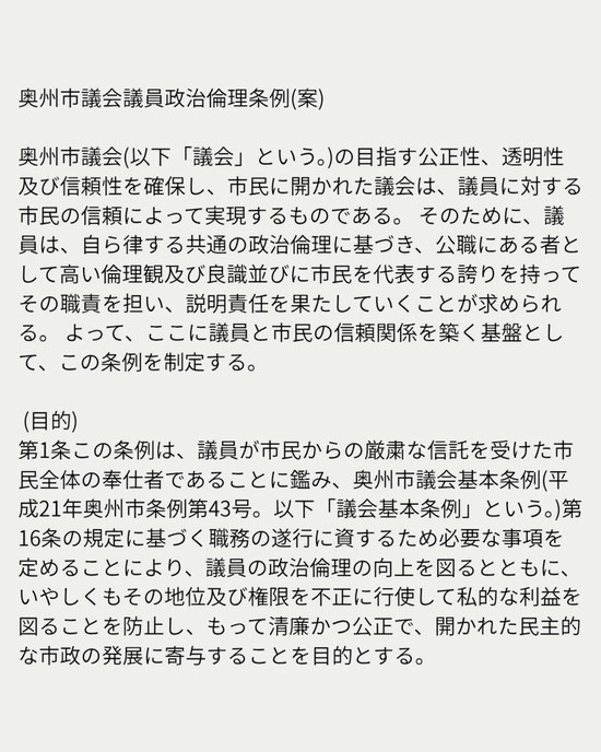 私が委員長を務める議会運営委員会でこの間、奥州市議会議員政治倫理条例の制定を目指して取り組んで参りました。19日の全員協議会にて、ようやくパブリックコメントを実施する段階にまできたことを報告できましたので、少しだけホッとしているところです。...